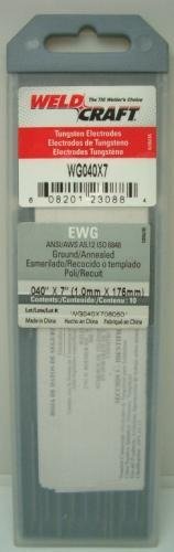 Weldcraft Tungsten Electrodes Package of 10 Tungsten Electrodes MFG # WG040X7 Type: Rare Earth Tungsten (EWG) Combines the best of all alloying elements and provides excellent arc stability in AC or DC welding. Size: .040" X 7" (1.0 mm X 175 mm) Applications: DC or AC Inverters Alloying Element: Cerium, Lanthanum, Yttrium, and others Composition: 97.3% Tungsten, Balance: Cerium, Lanthanum, Yttrium, and Others Materials welded: All